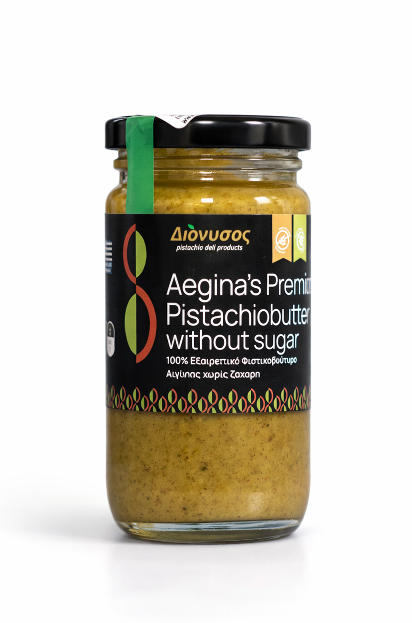 Aegina’s Premium Pistachio Butter este un produs obținut din 100% miez de fistic grec din insula Aegina, fistic de cea mai înaltă calitate – recunoscut cu denumire de origine protejată (PDO) la nivel european. Realizat fără adaos de zahăr, fără uleiuri adăugate și fără conservanți, acest unt de fistic păstrează gustul autentic, intens și ușor dulceag al fisticului de calitate superioară.