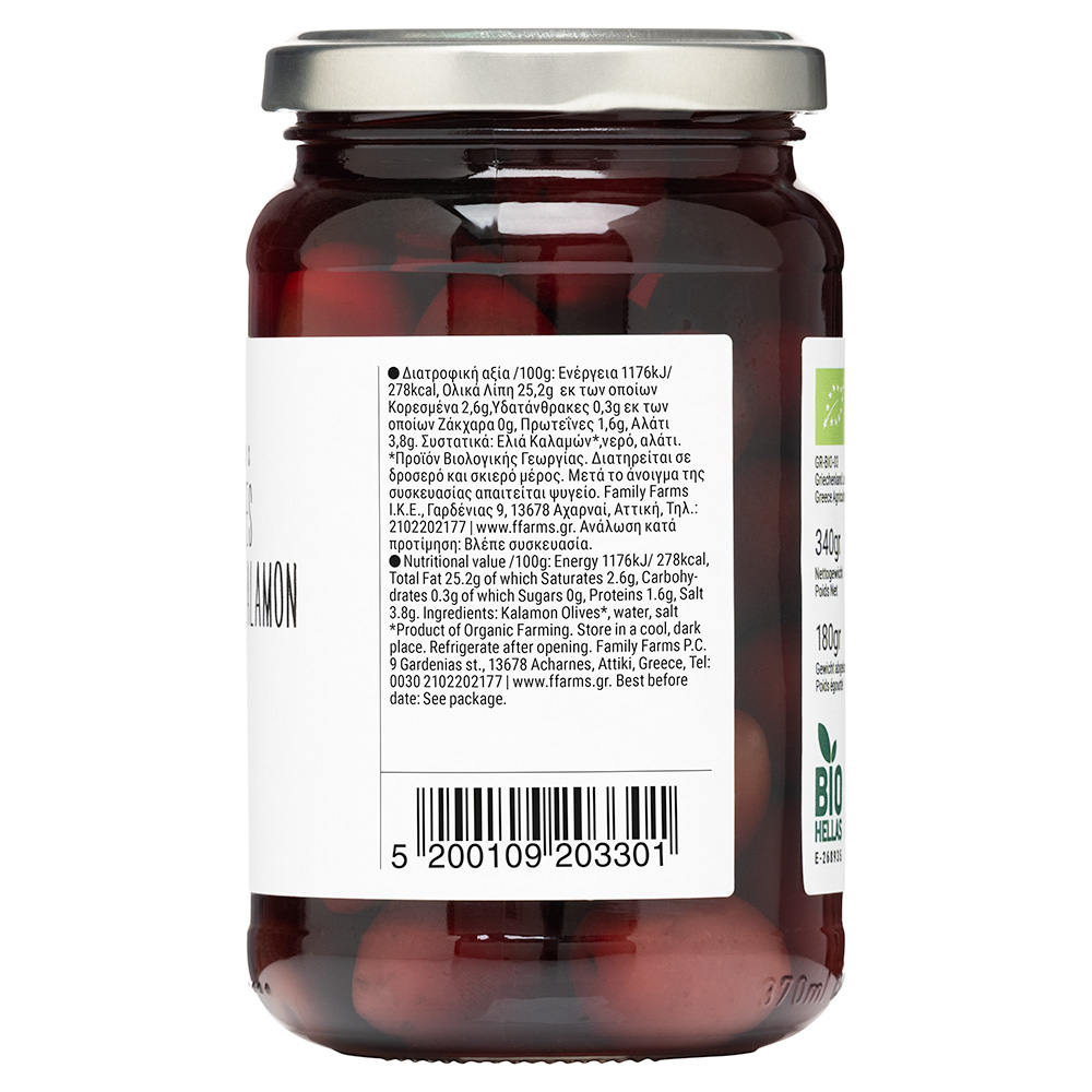Ingrediente principale: Măsline Kalamata* (aprox. 86%), apă, sare de mare, acidifiant: acid lactic*. *Provin din agricultură ecologică certificată. Potrivit pentru vegani, vegetarieni și lacto-vegetarieni.