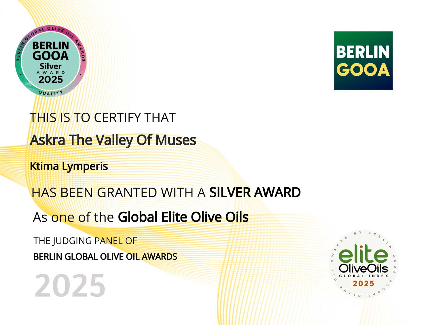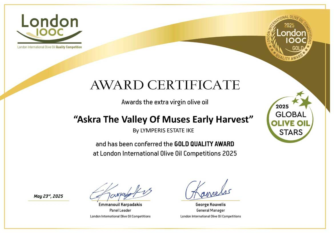 ASKRA - The Valley of Muses este rodul unei moșteniri familiale profunde, începută cu generații de cultivatori de măsline în Grecia. Fondat de familia Lymperis, cu rădăcini puternice în comerțul cu ulei de măsline, estate-ul a fost creat pentru a controla întregul ciclu de producție: de la plantarea măslinilor până la îmbutelierea finală. Situat în satul Askra, pe coamele Muntelui Helicon – loc sacru al muzelor, sursă de inspirație pentru poeți și artiști antici –, moșia îmbină tradițiile străvechi cu tehnologii moderne de extracție.