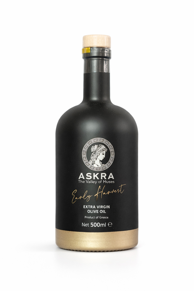 Ulei de Măsline Extravirgin Early Harvest "Askra - The Valley of Muses" 250ml Ambalat în sticlă Dorica neagră de 250ml, un scut împotriva luminii, acest trofeu vegan și certificat ISO 22000:2018, 9001:2015 & 14001:2015 a cucerit lumea: Aur la DubaiOOC 2025, Argint la Berlin GOOA și 26 de premii internaționale în doar patru ani. Lasă-ți bucătăria să respire poezie grecească – comandă acum și devino parte din legendă!