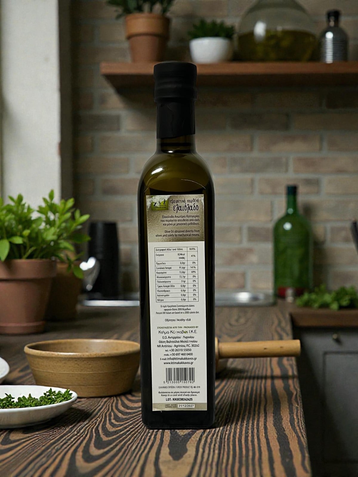 Produs de Estate Kakkavos I.K.E., un producător grec de familie din regiunea Messolonghi (Grecia), acest ulei de măsline extravirgin este obținut exclusiv din soiul Koroneiki – considerat „regina măslinelor” în Grecia, renumit pentru calitatea superioară și conținutul ridicat de polifenoli (antioxidanți naturali).